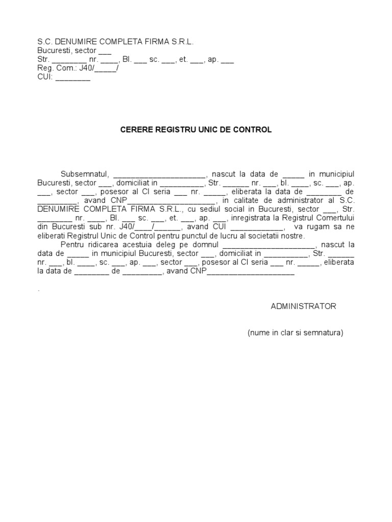 Cerere ref registru de evidenta fiscala registru unic de control reinvent consulting ruc intr un articol trecut vorbeam despre documentele ce va model cerere registrul unic de control format doc model cerere registrul unic de control format pdf vezi și acte necesare pentru achiziționarea registrului. In registrul unic de control sunt evidentiate, practic, toate verificarile desfasurate la contribuabili de catre organele de control ale statului. 6 din lege, registrul unic de control se elibereaza, contra cost, de directiile generale ale finantelor publice din raza teritoriala unde isi are sediul social aceasta in conditiile in care, in mod dezechilibrat, potrivit art. Identificator unic la nivel european; Ci acte necesare pentru ruc.