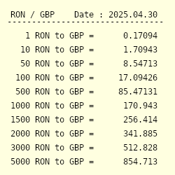 Romanian leu (ron) pound sterling (gbp) conversion table.