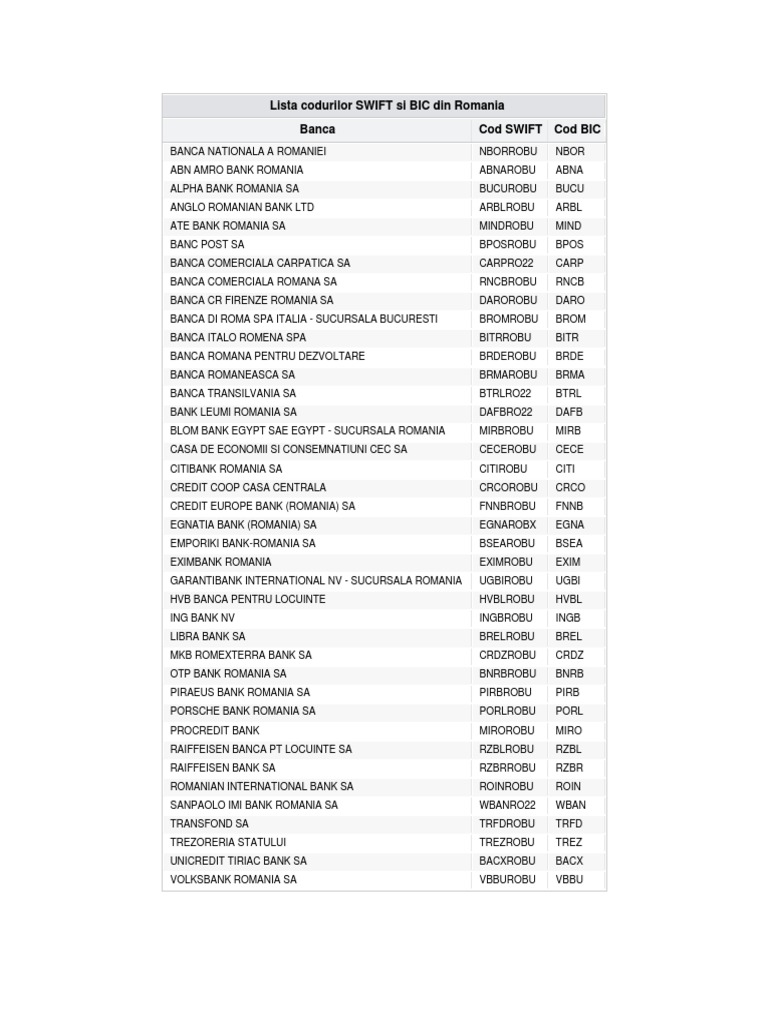 vizitati articolul complet aici : https://www.scribd.com/doc/93197743/lista-coduri-bancare Banca transilvania s a swift codes are used when transferring money between banks, particularly for international wire transfers, and also for the exchange of other messages between banks. Codul swift este codul unic de identificare al fiecarei banci sau institutii financiare in intreaga lume si este utilizat in cadrul operatiunilor bancare in valuta. Swift codes from all banca transilvania s.a.