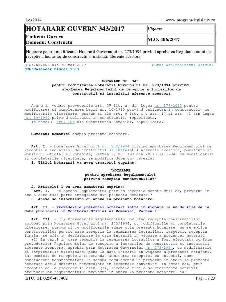 Hgr 273 din 1994 actualizata iul 2017 receptia construnctiilor. Forma actualizat a acestui act normativ la data de 3 iunie 2014 este realizat de ctre. 108 din constitutia romaniei, republicata, guvernul romaniei adopta prezenta articol unic regulamentul de receptie a lucrarilor de constructii si instalatii aferente acestora, aprobat prin hotararea guvernului nr.