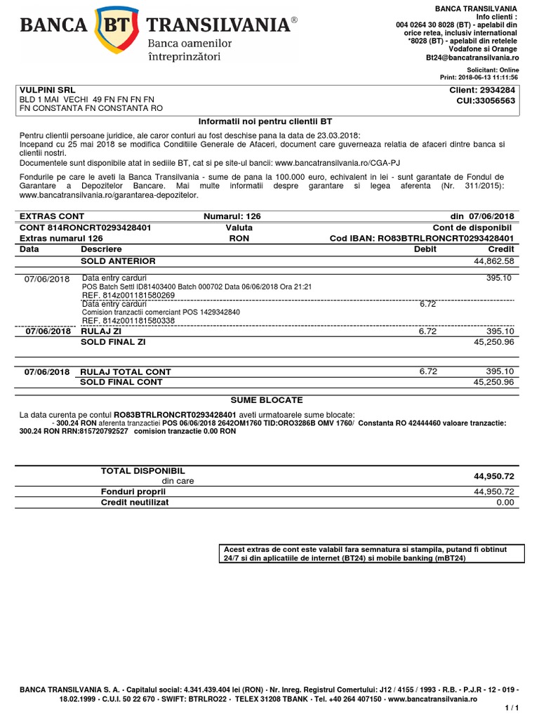 Business description, credit ratings, deposit guarantee scheme, financial positions, market share, contacts, social networks banca transilvania was founded in 1994 as a local bank, but rapidly expanded to the regional and then national level. Operatiuni la automatele de plati, la atm, la bt express plus. Am extras din aprilie de la banca transilvania si nu stiu cat este valabil imi trebuie acum.